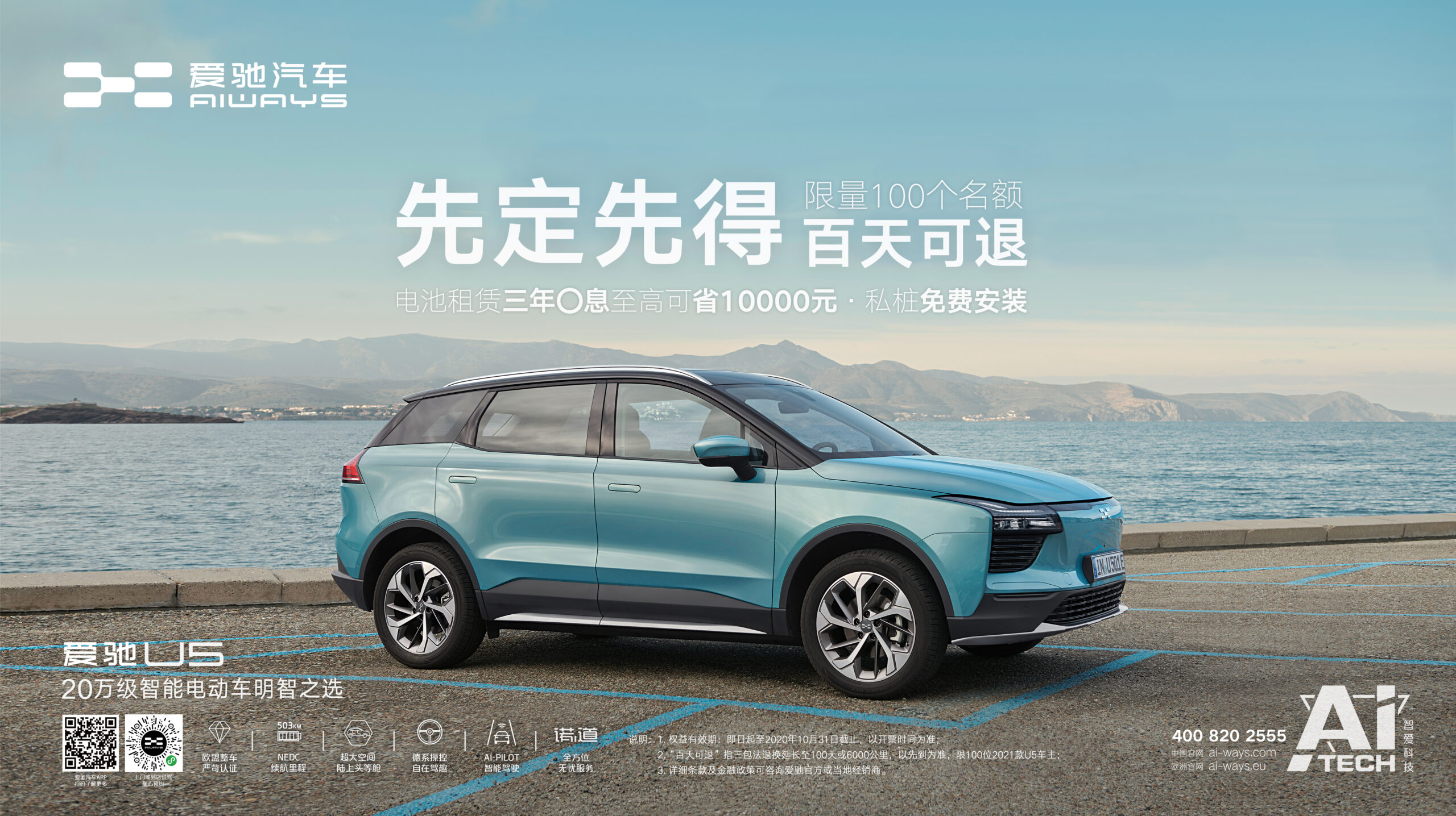 除了看得见摸得着的升级体验,爱驰汽车依托强大的产品力,为用户带来实实在在的用车权益。即日起至10月31日,凡在100天内或行驶里程6000公里以内(先到为准),车辆出现达到国家三包法规定更换车或退车条件的质量问题(三包法规定60天内或3000公里内),车辆可予以退换,全国限量100台。2021款爱驰U5将全面降低购车门槛,借助AI-BaaS电池租赁服务,用户可享电池租赁3年0息的金融政策,让购车无压力。另外,提供免费赠送个人充电私桩及安装服务。