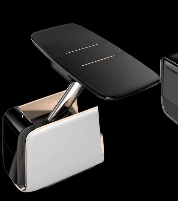 智能移动Console,可从中间分离,滑动至第三排,集成了:升降伸缩桌板+冰箱+杯托+空气净化器+触控屏